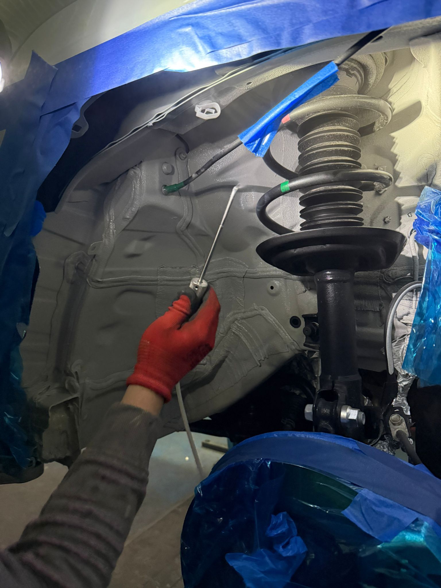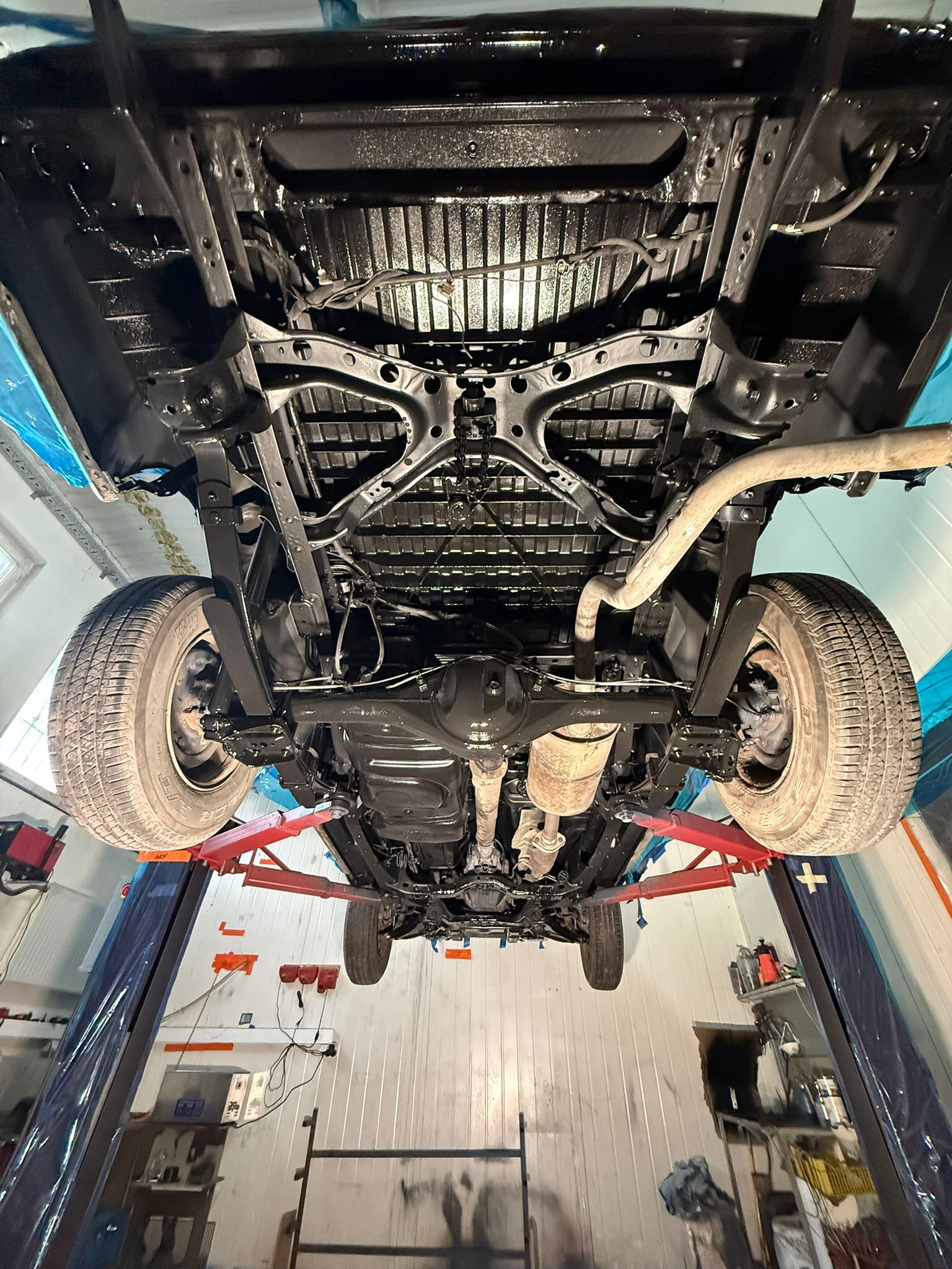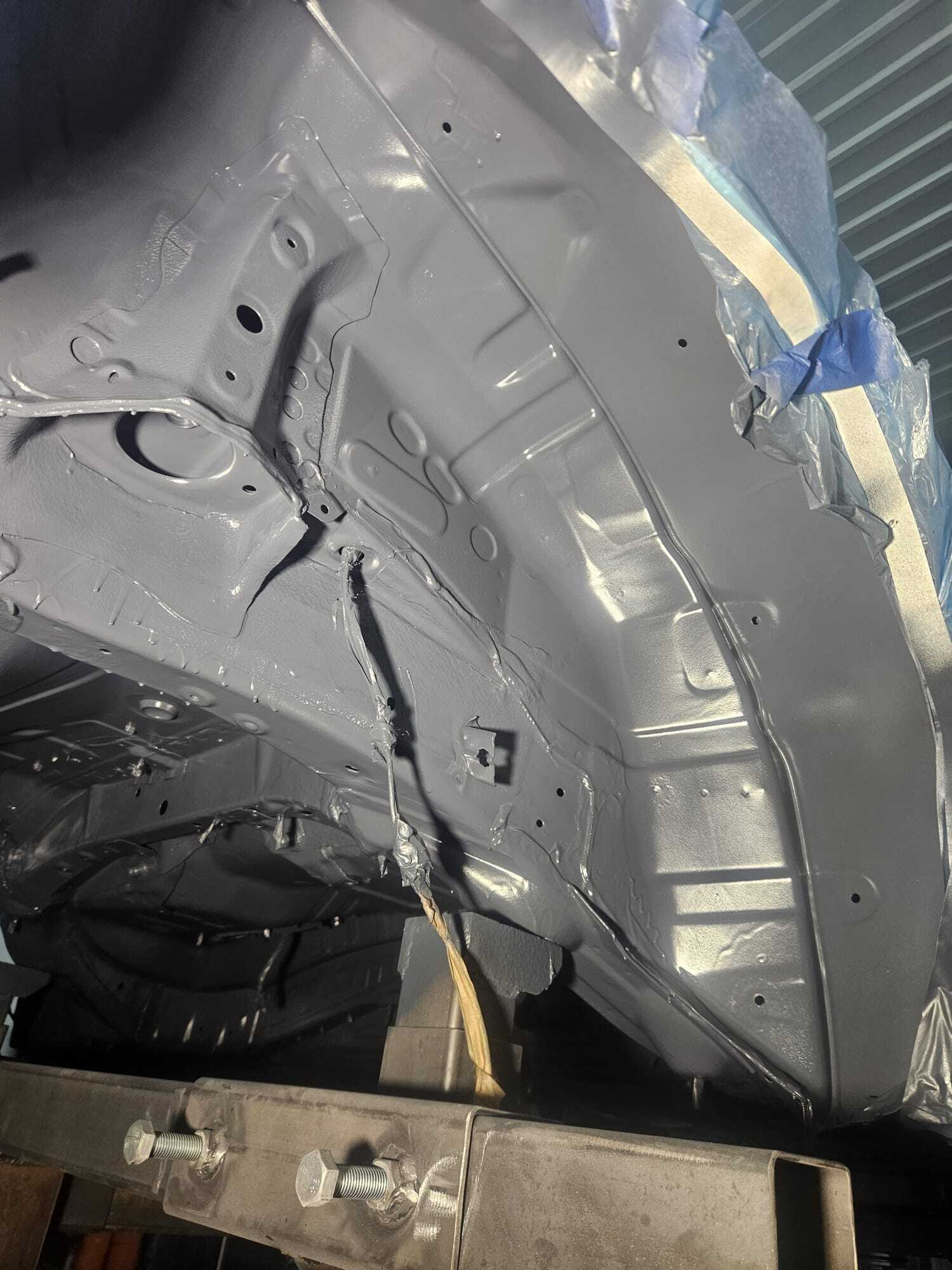 Jeżeli podwozie auta było wcześniej piaskowane lub oczyszczane laserowo zostaje pokryte 2-warstwową powłoką okrętowej farby epoksydowej oraz wierzchnią warstwą farby poliuretanowej odpornej na warunki zewnętrzne. Na życzenie klienta jako dodatkową usługę możemy odtworzyć mastyki na łączeniach blach oraz nanieść masy polimerowe w elementy tak jak nadkola, progi, podłużnice lub całą płytę podłogową Na sam koniec procesu starannie pokrywamy całe podwozie, zawieszenie oraz wnęki kół dedykowanym produktem wosku bezbarwnego WAXOYL Polska którego jesteśmy licencjonowanym warsztatem współpracującym.